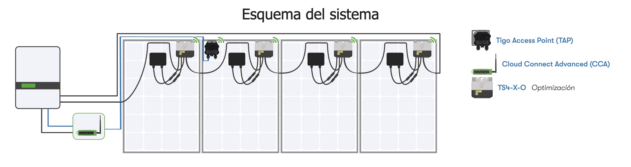 El TS4-X-O requiere Tigo Access Point (TAP) y Cloud Connect Advanced (CCA) para habilitar la monitorización y el apagado rápido a nivel de módulo. Además, puede integrarse con el RSS Transmitter (opcional), ofreciendo apagado rápido multifactor para un nivel adicional de seguridad.