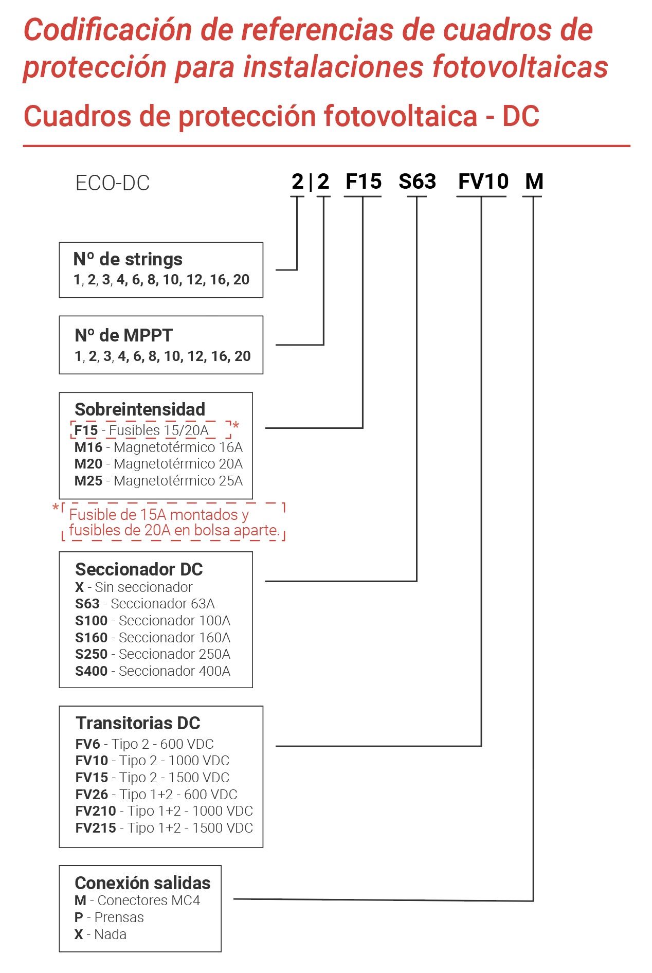 La gama ECO-DC permite agrupar varios strings en una única salida DC (+/–) y está disponible en diferentes configuraciones según la corriente y el tamaño de la instalación, con tensiones de trabajo de hasta 1000 VDC. Su diseño con grado de protección IP65 asegura un funcionamiento fiable incluso en entornos exigentes.